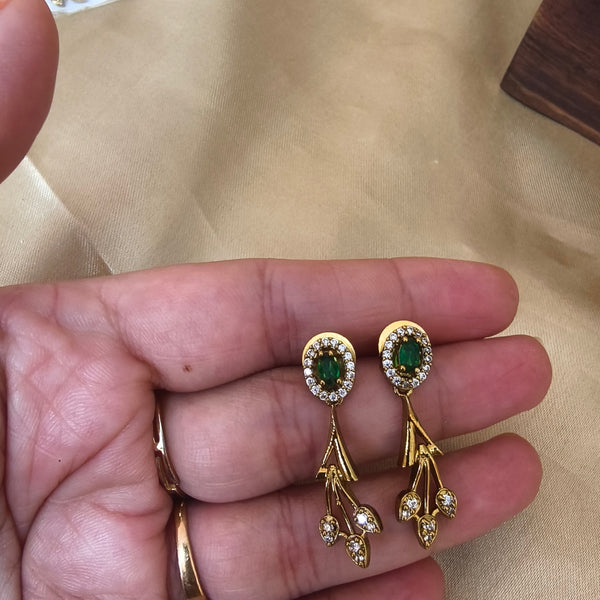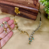 Step into elegance with this Emerald Grace Antique Necklace Set, a stunning fusion of tradition and modern artistry. Crafted with a unique asymmetric design, the necklace features intricate floral patterns on one side and sparkling stone-studded circles on the other, creating a bold yet graceful balance. The hanging emerald-green drops add a refreshing charm, making it a standout piece for weddings, festive occasions, and special celebrations.