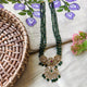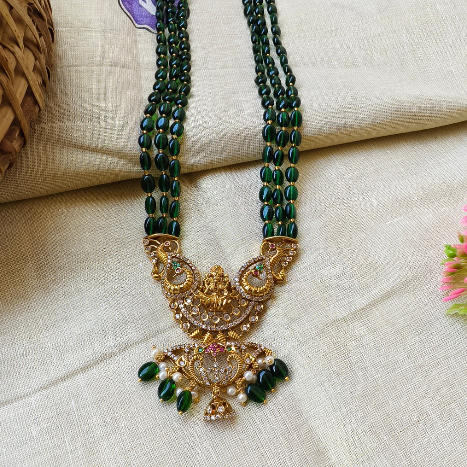 Embrace royal elegance with the Peacock Radiance Beads Haram, featuring four strands of rich green beads and a striking gold-finish pendant adorned with peacock motifs, sparkling stones, and graceful pearls with goddess Lakshmi devi in the center of the haram. This handcrafted piece is perfect for weddings, festive occasions, and bridal events, capturing the spirit of traditional luxury with a contemporary vibe.