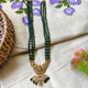 Exude regal opulence with the Majestic Ruby Beads Haram. This statement necklace showcases triple strands of bold ruby-red beads with ornate dual gold-finish pendants, featuring intricate filigree, peacock motifs, and sparkling stones for unforgettable festive and bridal looks. It blends traditional charm and contemporary luxury, adding magnificence to sarees, lehengas, and special occasions.