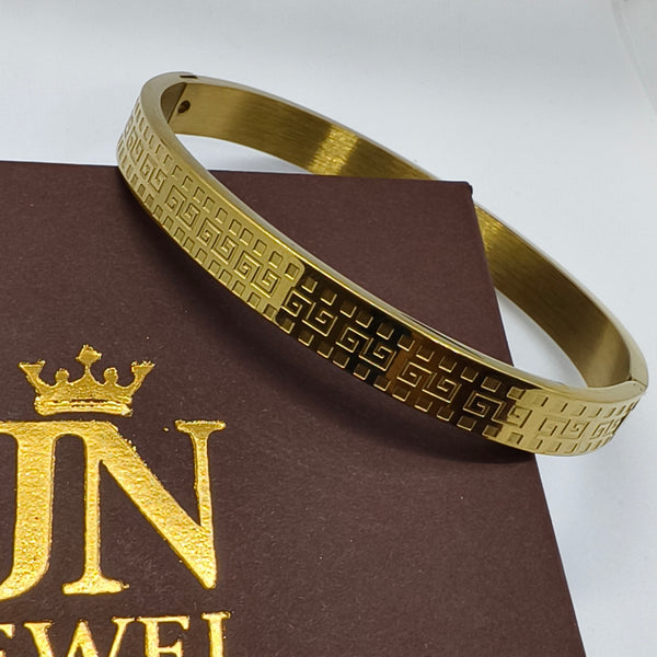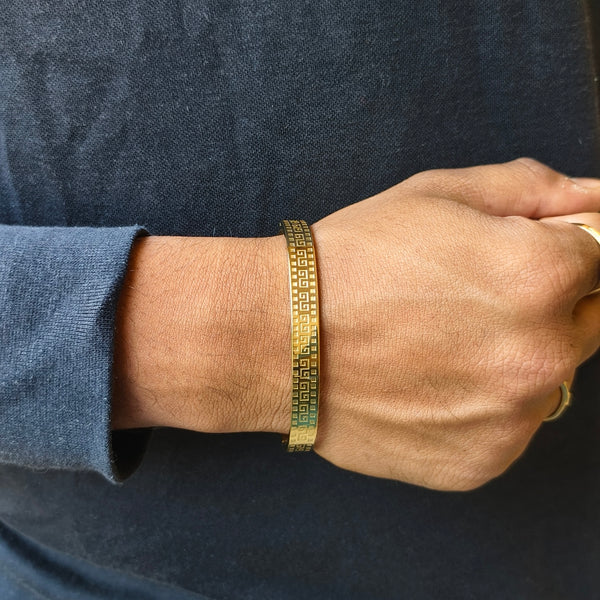 Redefine your wrist game with the HexaGold Kada—a bold, anti-tarnish designer kada crafted for men who want a touch of luxury and lasting shine. Featuring a geometric Greek key design and premium gold-plated stainless steel, this kada is waterproof, rust-free, and skin-friendly—perfect for everyday wear or special occasions.