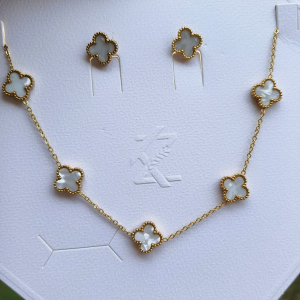 Elevate your style with the Luxe White Clover Glow Set, featuring a radiant chain and matching stud earrings adorned with elegant white clover charms. Crafted with advanced anti-tarnish technology and gold-plated for lasting brilliance, this set adds a fresh, modern twist to classic elegance. Shine effortlessly in every look, whether for everyday wear or special occasions.