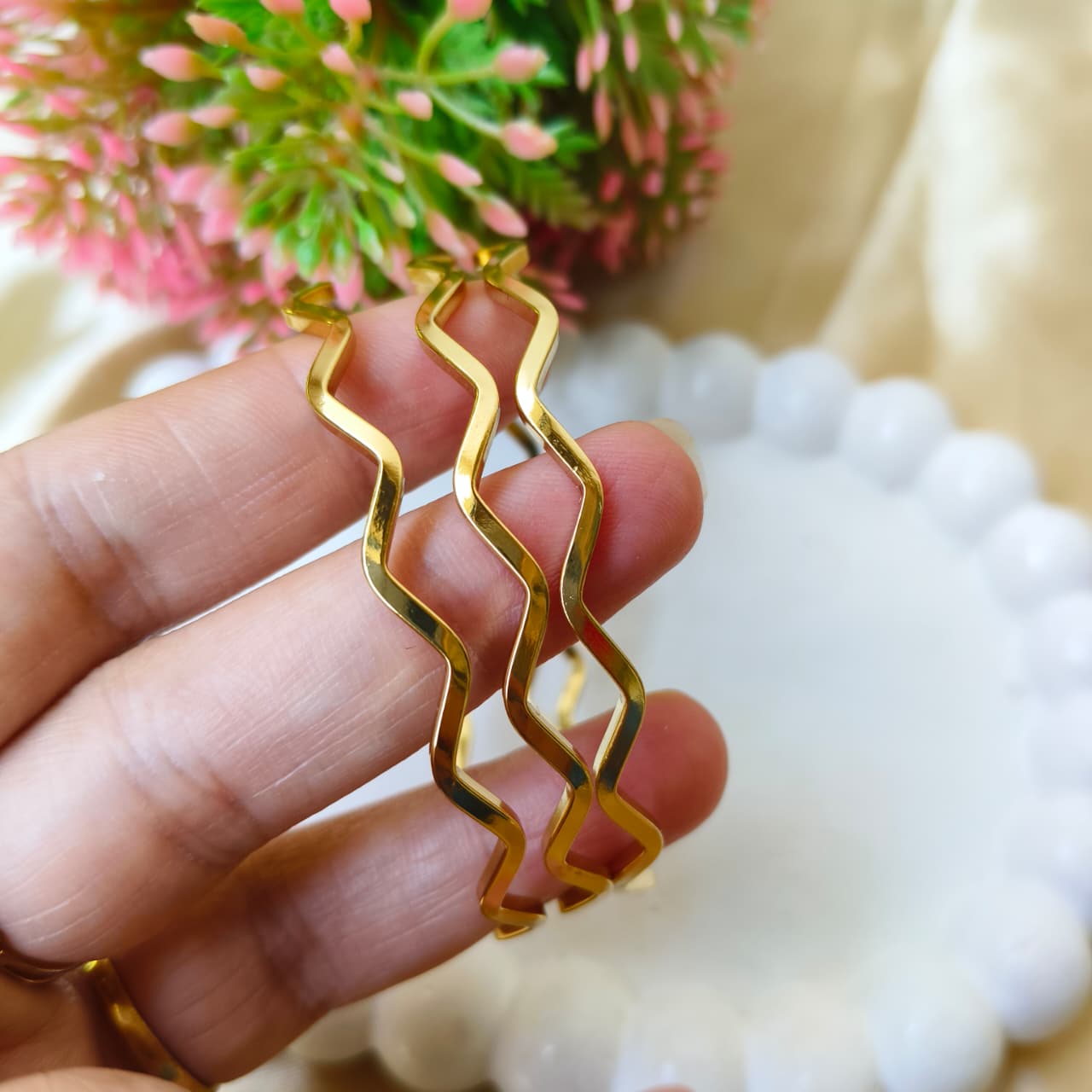 Make a bold yet elegant statement with the Wave Luxe Anti-Tarnish Bangle Set, designed to redefine everyday glamour. Featuring a unique wavy silhouette with a mirror-finish gold tone, these bangles bring a modern twist to a timeless classic. Crafted with premium anti-tarnish plating, they retain their shine and brilliance wear after wear. Perfect for stacking or flaunting solo, this set adds effortless sophistication to any outfit — from festive looks to casual chic.