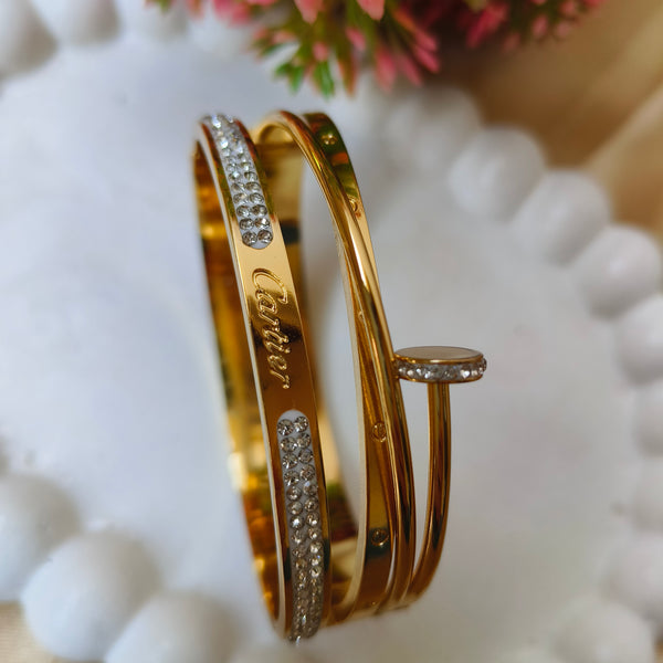 Turn heads with our Trinity Luxe Spark Bracelet, a stunning statement piece crafted with a premium anti-tarnish gold finish for everlasting shine. Designed with a triple-band style, it features a mix of crystal-studded accents and a chic modern twist motif, giving it a bold yet sophisticated appeal.
