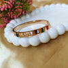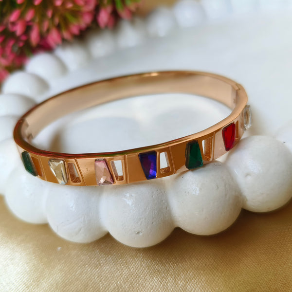 Brighten up your style with the Spectrum Shine Bracelet. This stunning piece features a sleek 18K rose gold plated band adorned with multi-colored gemstone accents, adding a playful yet elegant charm to your look. Crafted from premium stainless steel, it is anti-tarnish, hypoallergenic, and designed for long-lasting brilliance. Perfect for those who love to express their personality through colors, this bracelet makes a versatile accessory for casual outings, festive wear, and gifting.