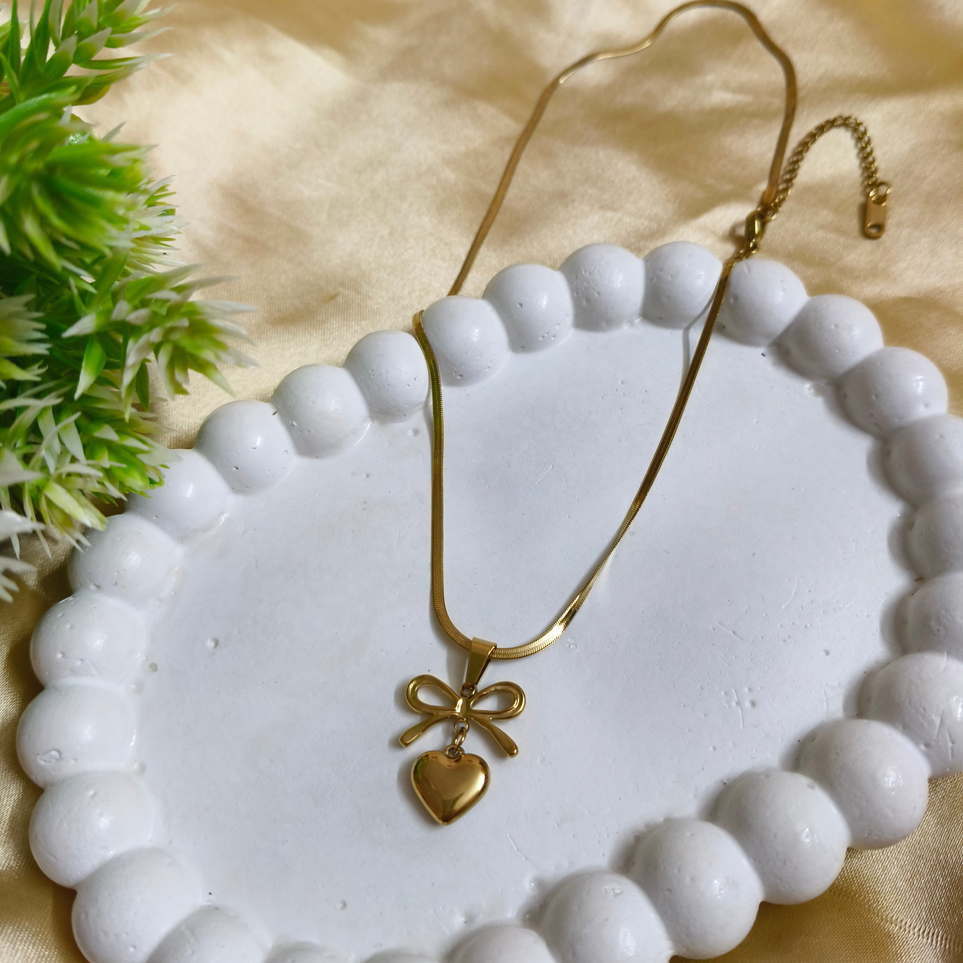 Embrace feminine nostalgia with the Coquette Bow Charm Heart Pendant Chain—2025’s must-have accessory for effortless romance. This anti-tarnish necklace features a gleaming gold herringbone chain, elegantly adorned with a delicate bow and a shiny heart charm. Inspired by the rising “bow jewelry” and “coquette” trends, it combines softness and strength, tradition and modern style. Crafted from premium stainless steel with advanced anti-tarnish plating, this lightweight, hypoallergenic piece keeps its everlasting brilliance and comfort through daily wear and celebrations.