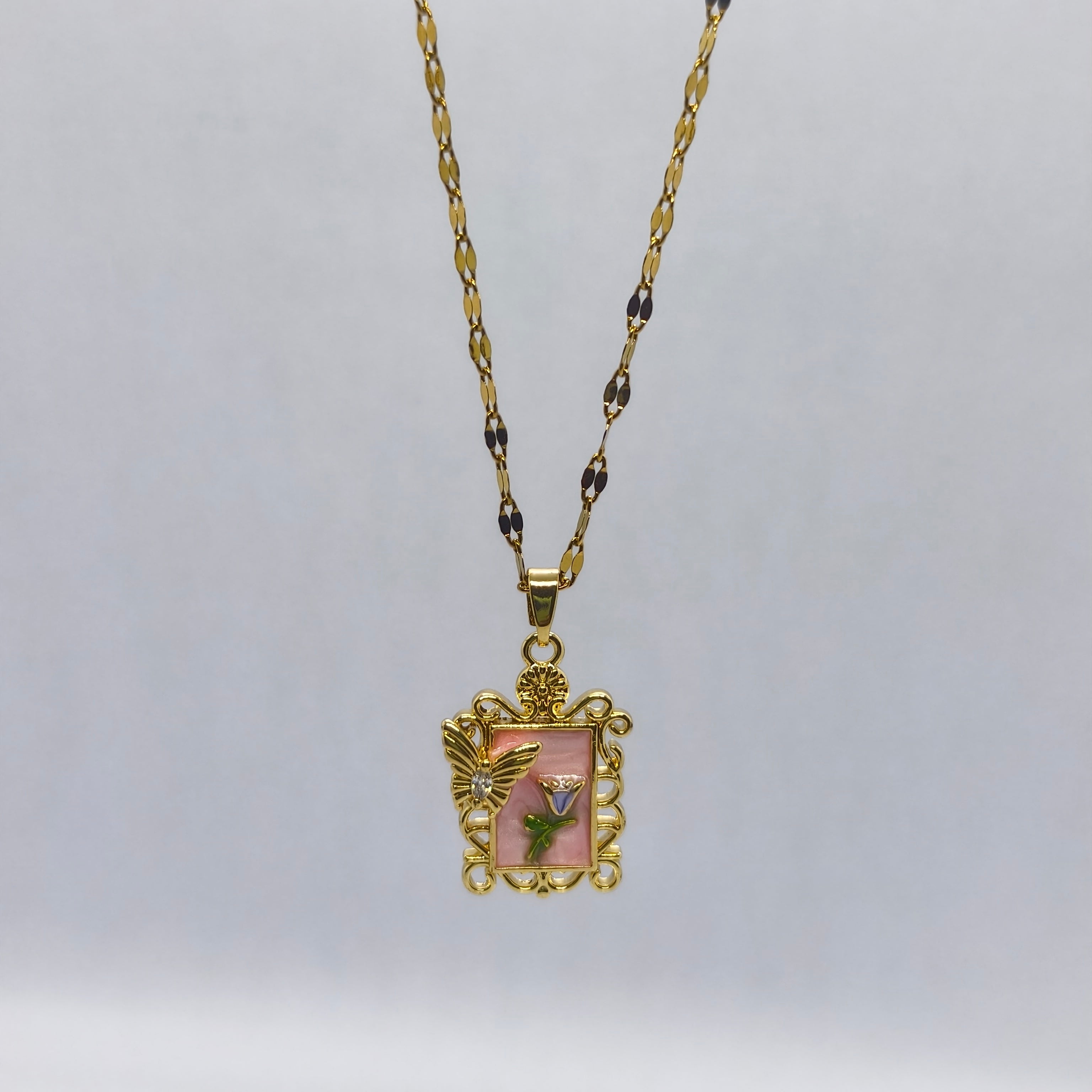 Elevate your style with the BlushBloom Butterfly Pendant Chain—a whimsical gold-plated necklace featuring a pastel pink enamel frame, a radiant butterfly, and a delicate floral accent for a touch of nature-inspired charm. Crafted with an advanced anti-tarnish finish, this pendant chain promises lasting brilliance and effortless elegance for daily style or gifting.