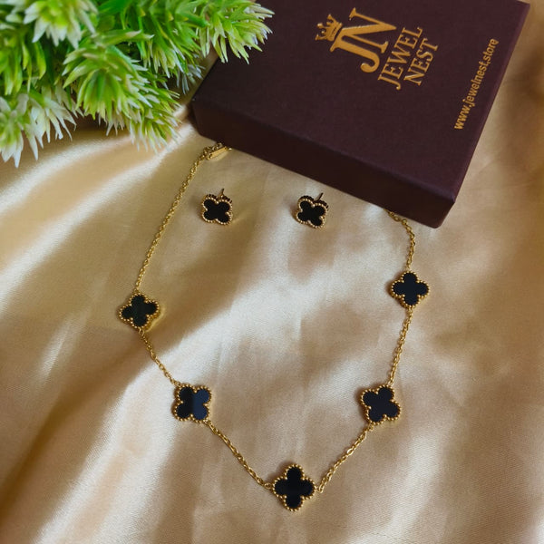 Elevate your style with the Luxe Black Clover Glow Set, featuring a radiant chain and matching stud earrings adorned with elegant black clover charms. Crafted with advanced anti-tarnish technology and gold-plated for lasting brilliance, this set adds a fresh, modern twist to classic elegance. Shine effortlessly in every look, whether for everyday wear or special occasions.