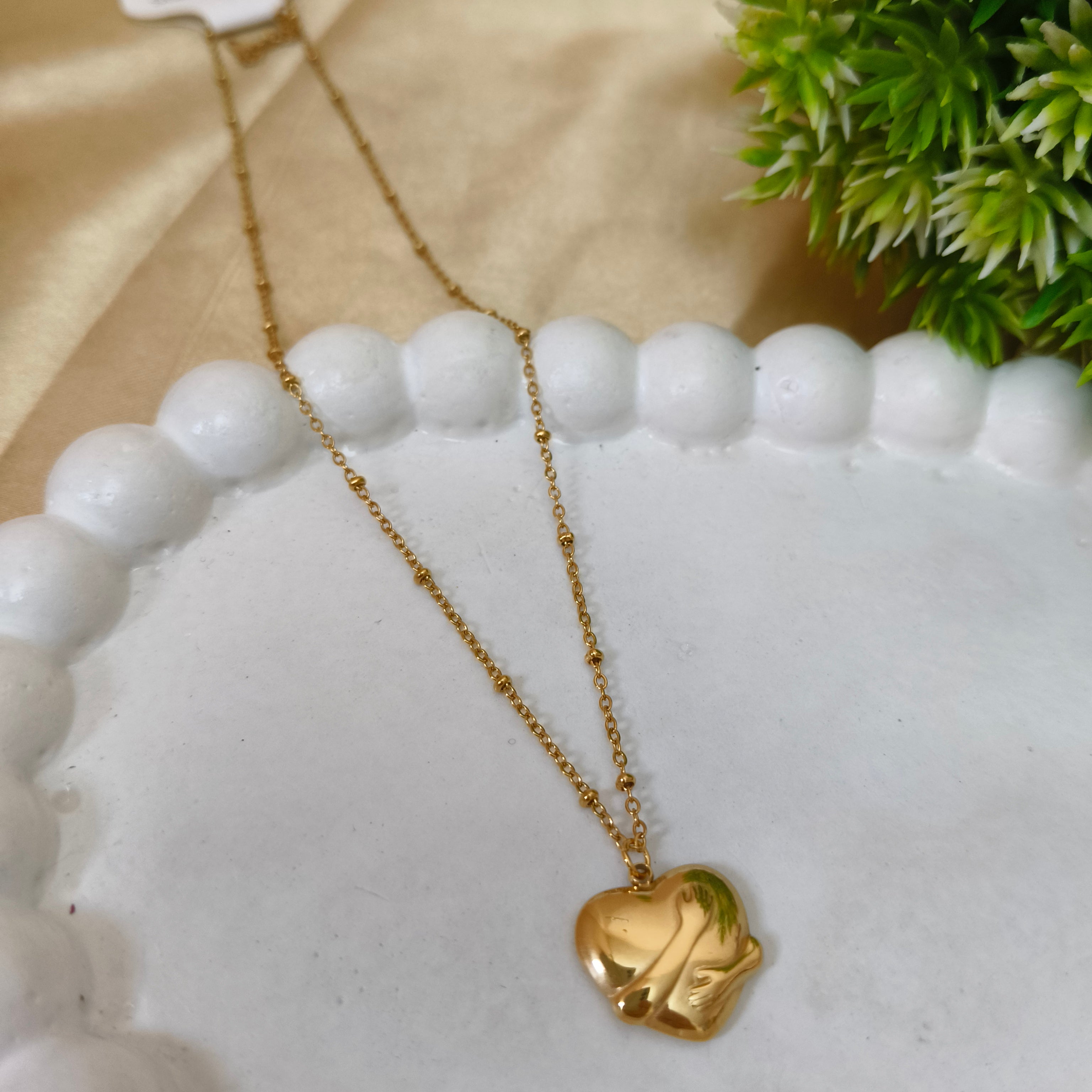The pendant features a heart shape elegantly wrapped by sculpted arms, symbolizing love, comfort, and emotional connection. Its radiant gold finish with anti-tarnish protection guarantees long-lasting brilliance and easy care. The bead-accented chain adds a touch of modern minimalism, ensuring that the necklace blends seamlessly with both casual and dressy outfits.