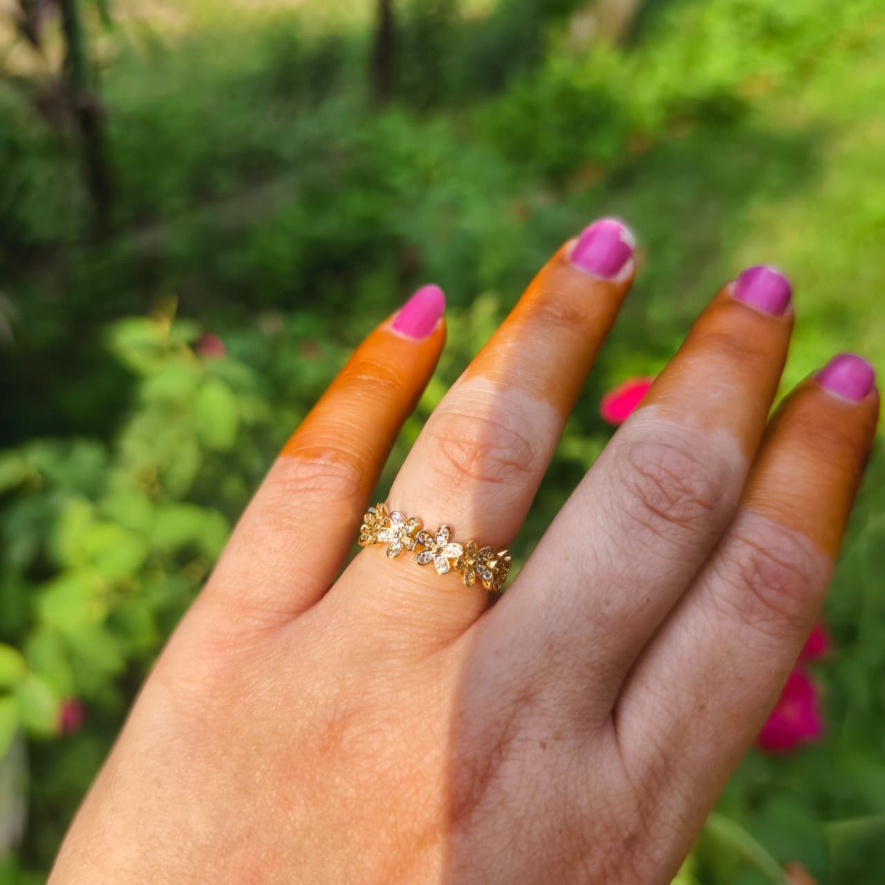Bring a touch of springtime charm to your everyday style with the Blossom Shine Anti-Tarnish Gold Ring. Adorned with delicate floral motifs and sparkling cubic zirconia stones, this ring radiates elegance and femininity. Its premium anti-tarnish coating keeps it glowing beautifully over time, making it perfect for daily wear or special occasions. A symbol of beauty and new beginnings, this floral ring is a must-have for every jewelry lover.