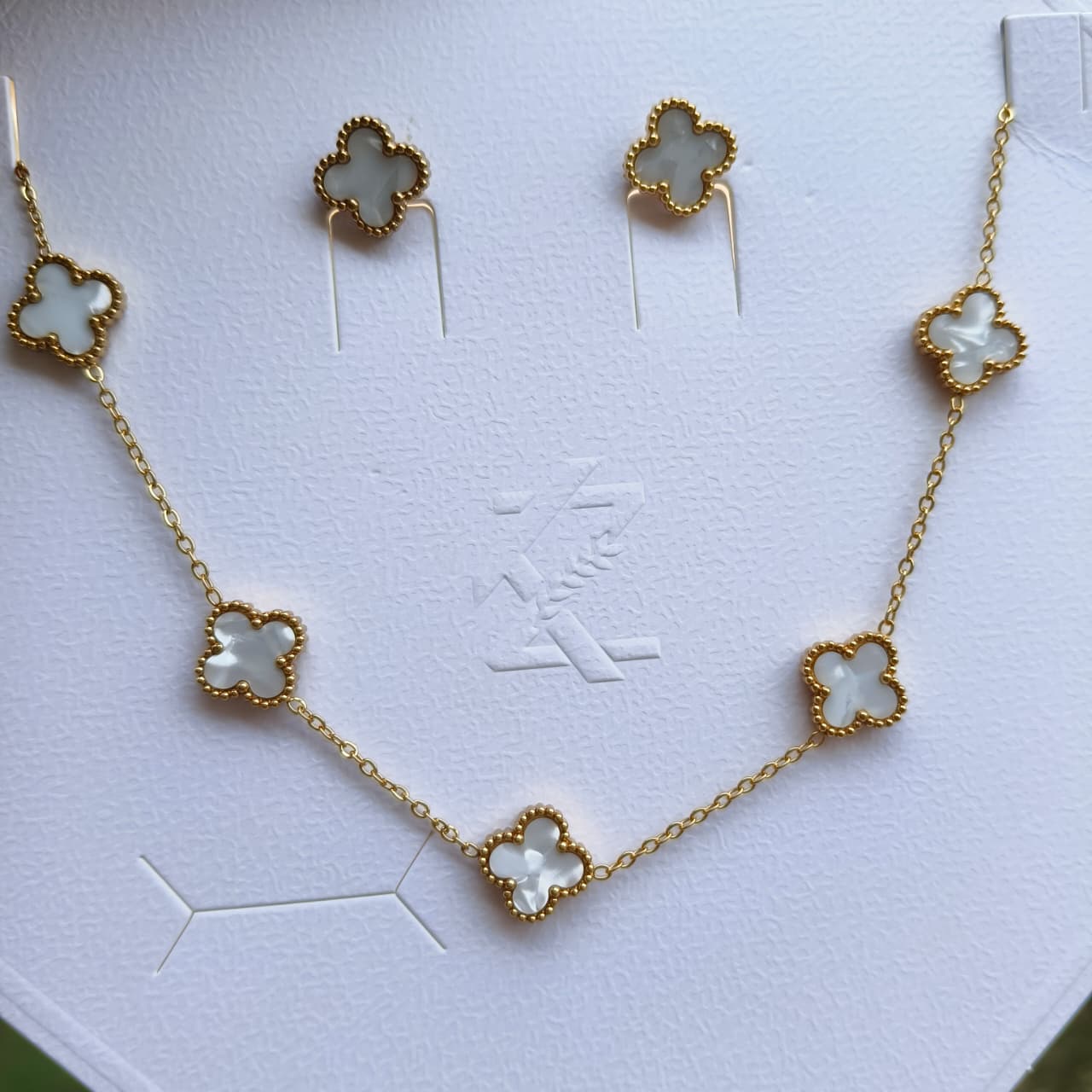 Elevate your style with the Luxe White Clover Glow Set, featuring a radiant chain and matching stud earrings adorned with elegant white clover charms. Crafted with advanced anti-tarnish technology and gold-plated for lasting brilliance, this set adds a fresh, modern twist to classic elegance. Shine effortlessly in every look, whether for everyday wear or special occasions.