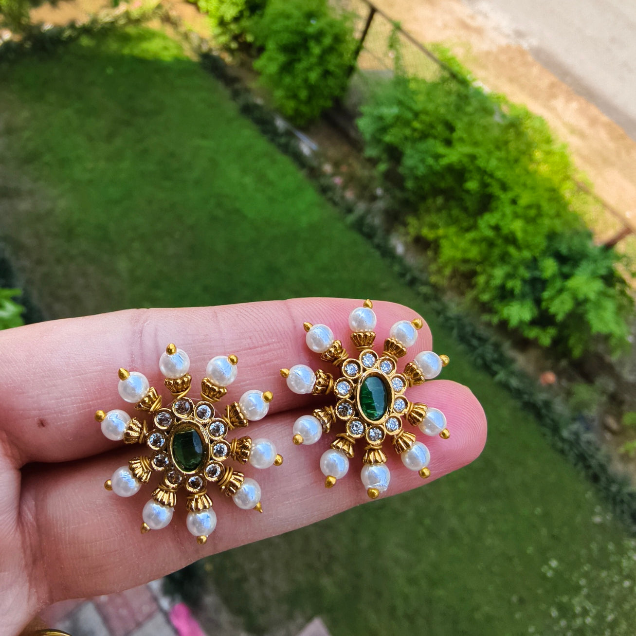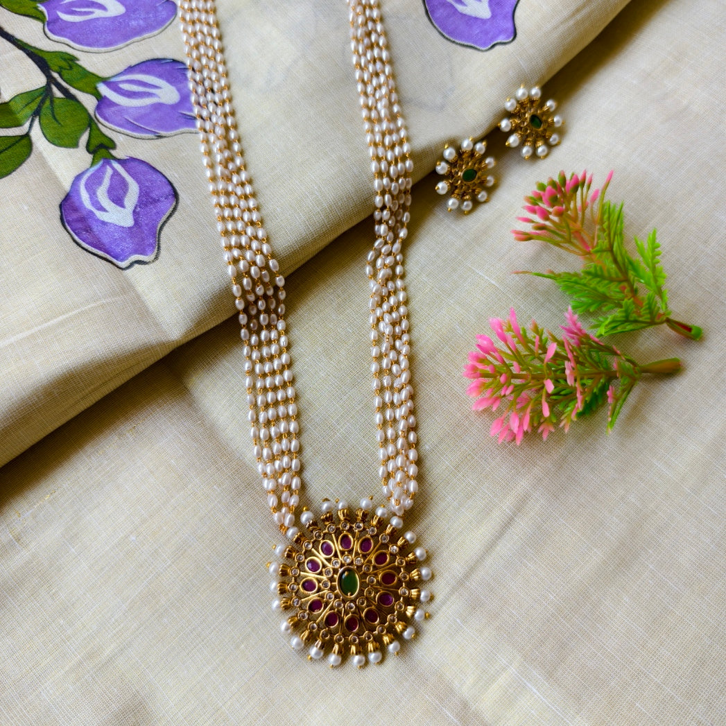 Radiate timeless grace with the Vintage Sunburst Pearl Haram. Featuring three rows of luminous pearls and a majestic round pendant encrusted with red, green, and white stones, this antique-finish necklace is the perfect accessory for elevating sarees and festive attire. Paired with matching floral earrings, this haram seamlessly blends heritage style and modern sophistication.