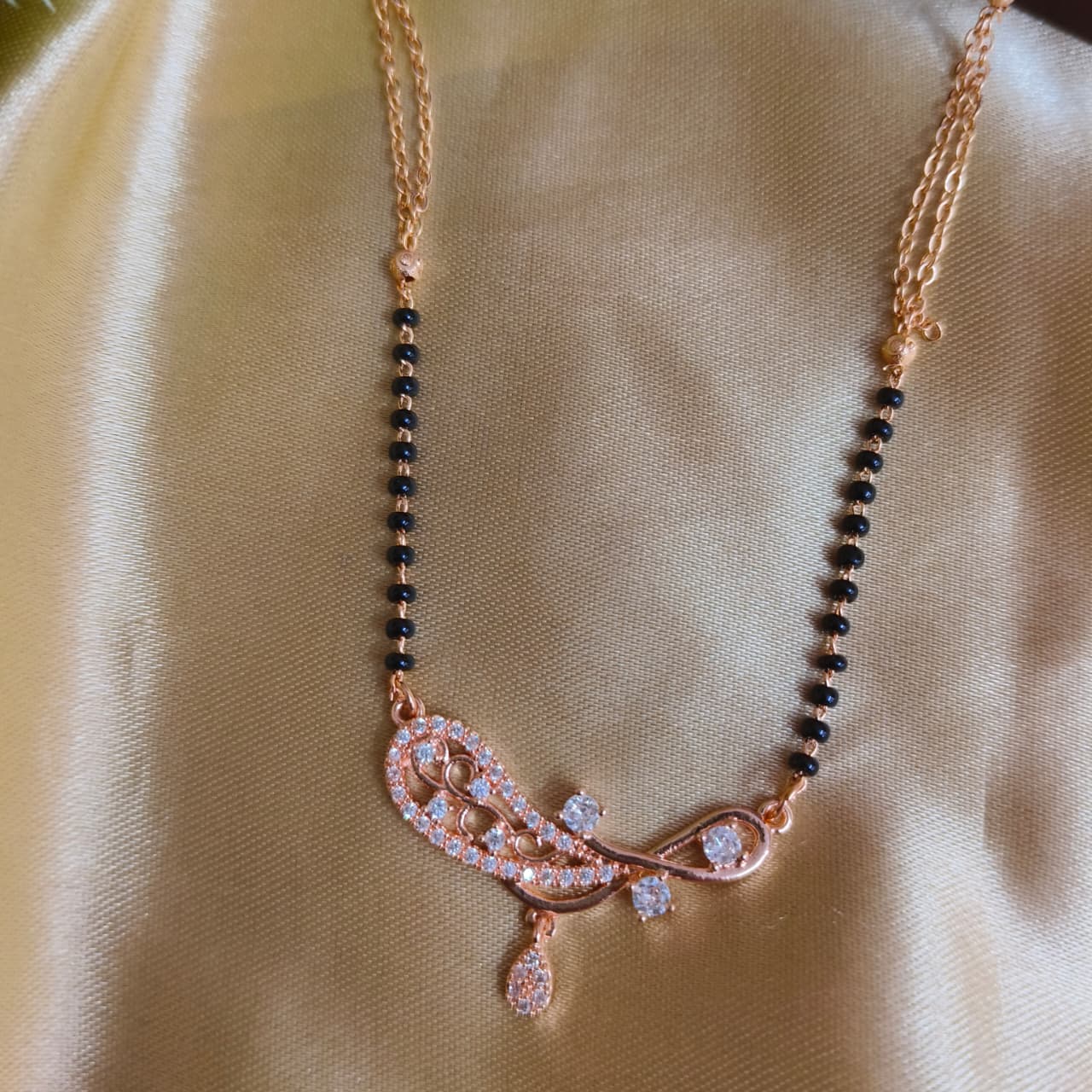 Elevate your ethnic elegance with the Swirl Shine Anti-Tarnish Mangalsutra. This unique piece features a sparkling swirl-inspired pendant on a classic black bead and rose gold chain, blending tradition with modern sophistication. Designed for daily wear, its advanced anti-tarnish technology ensures a lasting brilliant shine with zero fuss.