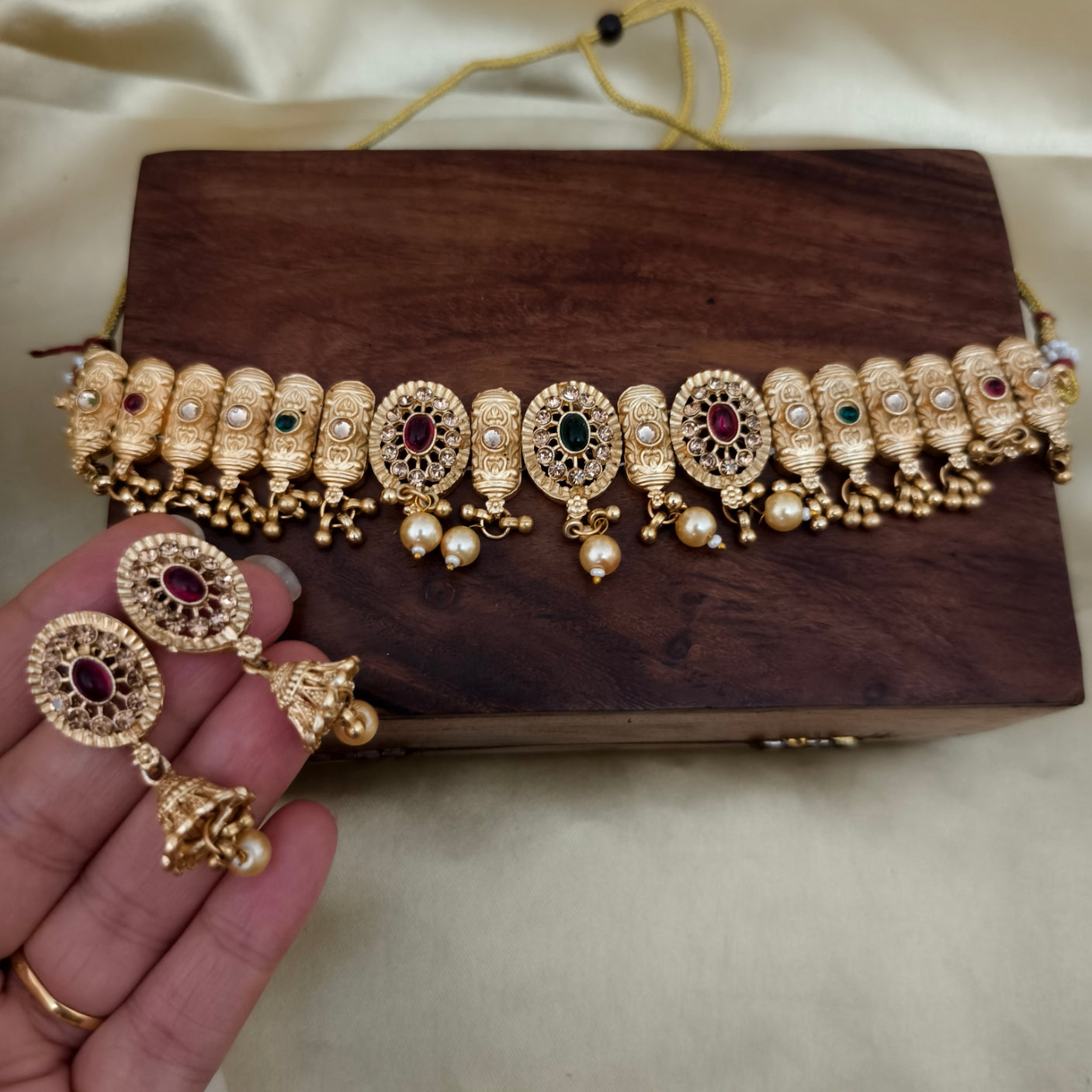 Embrace timeless elegance with our Antique Gold Temple Choker Set, inspired by traditional South Indian jewelry craftsmanship.