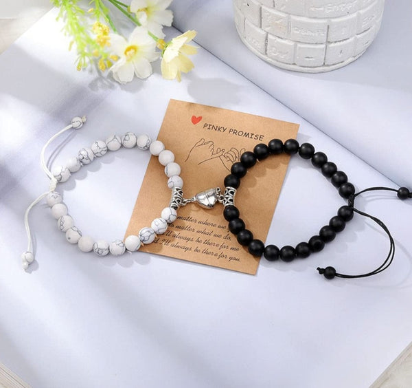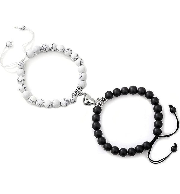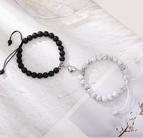 This set includes a black matte bead bracelet and a white marble bead bracelet, beautifully designed with a magnetic charm that instantly attracts when brought together – just like the bond between you and your partner.