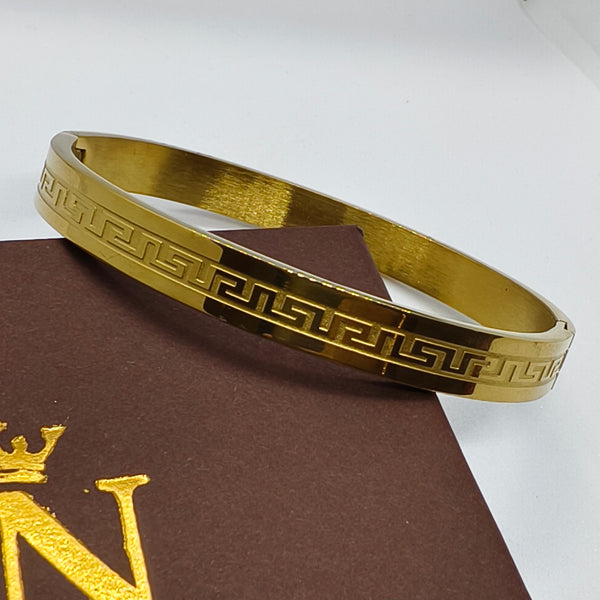 Add statement shine to your style with the Aureus Kada. This anti-tarnish men's gold kada features a bold Greek key design and high-gloss finish—crafted for those who value both tradition and trend. Its stainless-steel base, waterproof and hypoallergenic, ensures this piece stands out and stands strong through daily wear or special occasions.