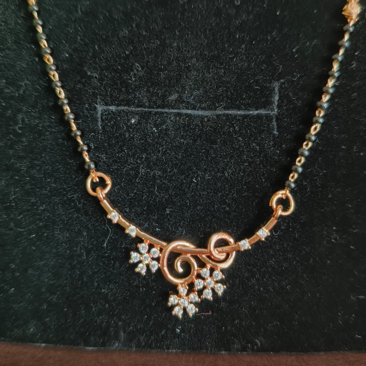 Celebrate tradition with a modern flair through the Floral Twist Anti-Tarnish Mangalsutra. This elegant piece features sparkling floral motifs and swirling curves on a radiant rose gold and black bead chain. Advanced anti-tarnish technology keeps it shining for everyday style and celebrations alike.