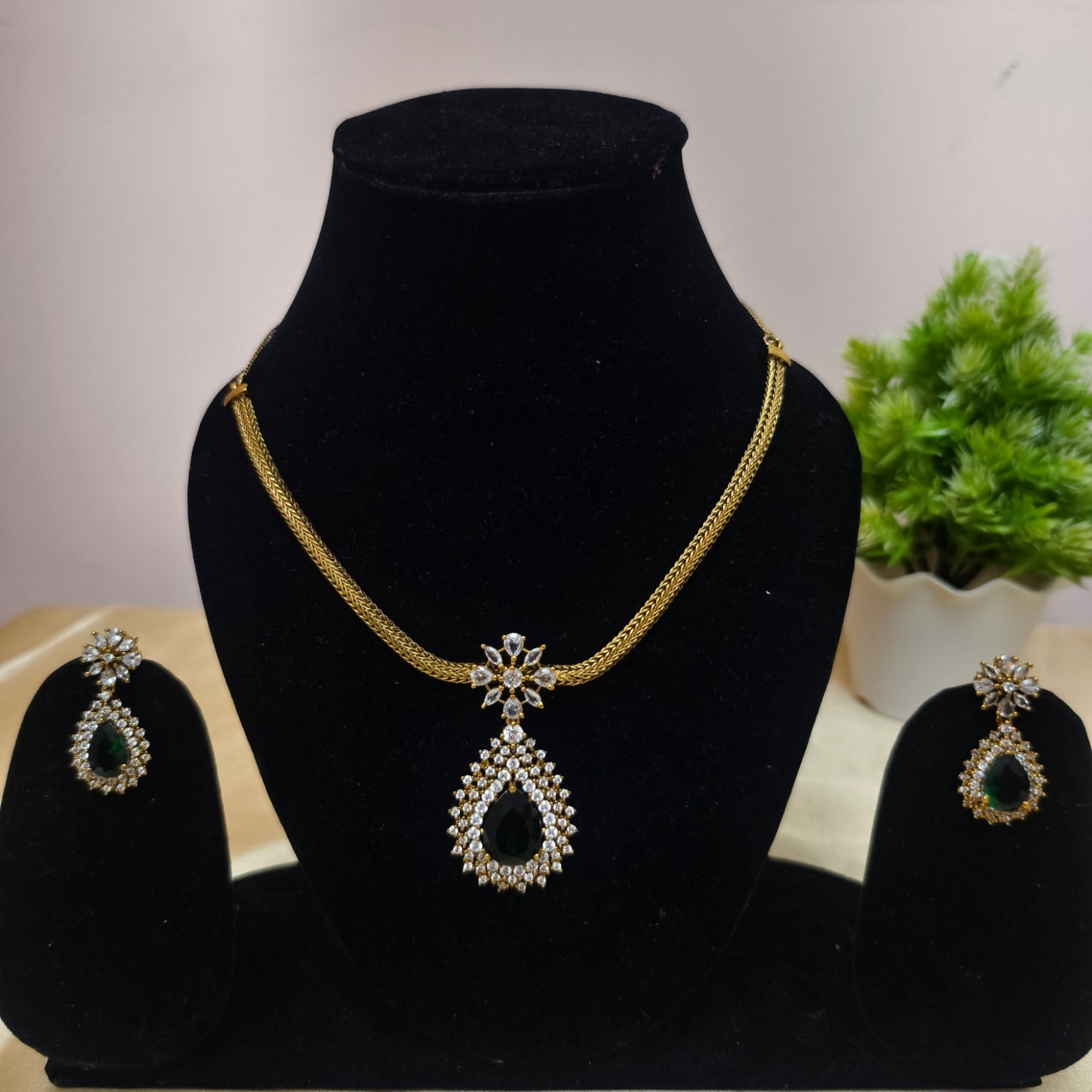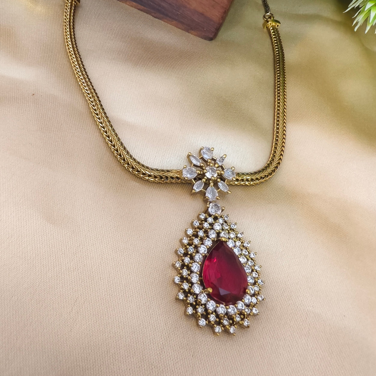 The Vintage Inspired Antique Necklace is an awe-inspiring jewelry ensemble, fusing classic grandeur with modern craftsmanship. This gold-toned necklace set features a striking teardrop-shaped ruby-red stone at its heart, framed by a dazzling halo of sparkling white stones and intricate floral motifs. The matching earrings mirror the grandeur of the pendant, offering a seamless and elegant finish. This versatile set is perfect for weddings, festive events, and adding a regal touch to any special occasion outfit.