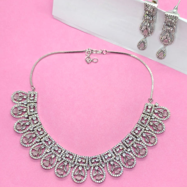 Add timeless elegance to your collection with this Crystal Bloom Round AD Necklace Set, beautifully crafted with Teardrop-Shaped Pink Stones outlined by sparkling American Diamonds (CZ stones). The wide designer choker-style necklace features intricate floral and paisley patterns, making it a true statement piece. Paired with matching drop earrings, this set brings a royal charm to your look.