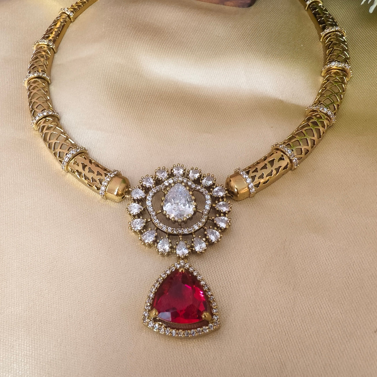 Make a bold and elegant statement with this Pendent style Traditional Kante necklace, crafted with intricate detailing and timeless charm. The necklace features a beautifully designed lattice-style chain paired with a dazzling centerpiece surrounded by sparkling stones and a teardrop pendant that enhances its royal appeal. Matching earrings complete the set, making it the perfect accessory for weddings, festive occasions, and grand celebrations.