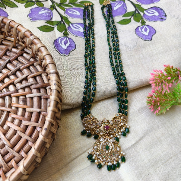 Infuse your festive style with opulence using the Enchanted Emerald Beads Haram. Featuring elegant strands of emerald green beads and dual ornate gold-finish pendants set with dazzling stones and pearls, this haram blends timeless luxury with modern sophistication. It pairs perfectly with sarees, lehengas, and ethnic outfits for weddings, parties, and special occasions.
