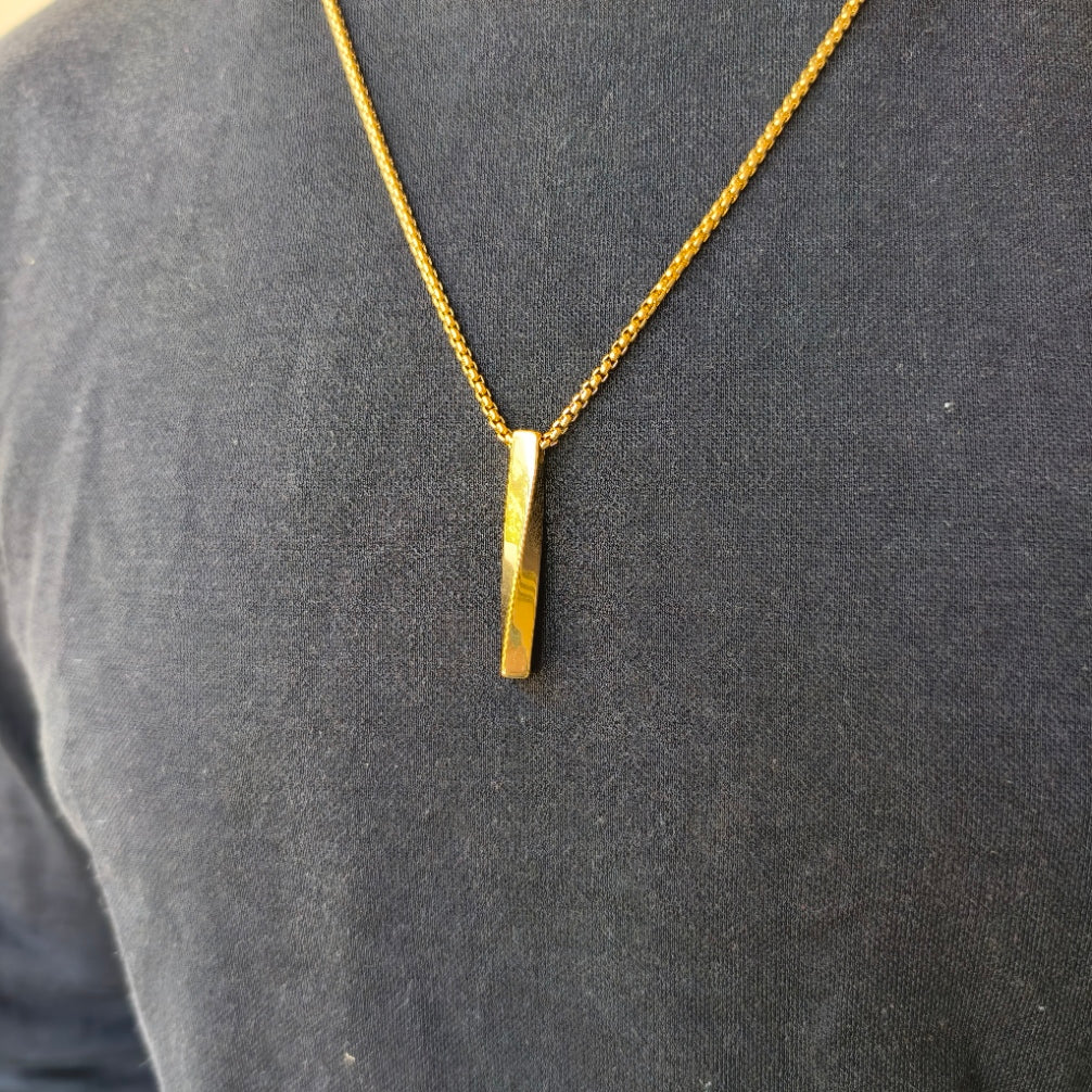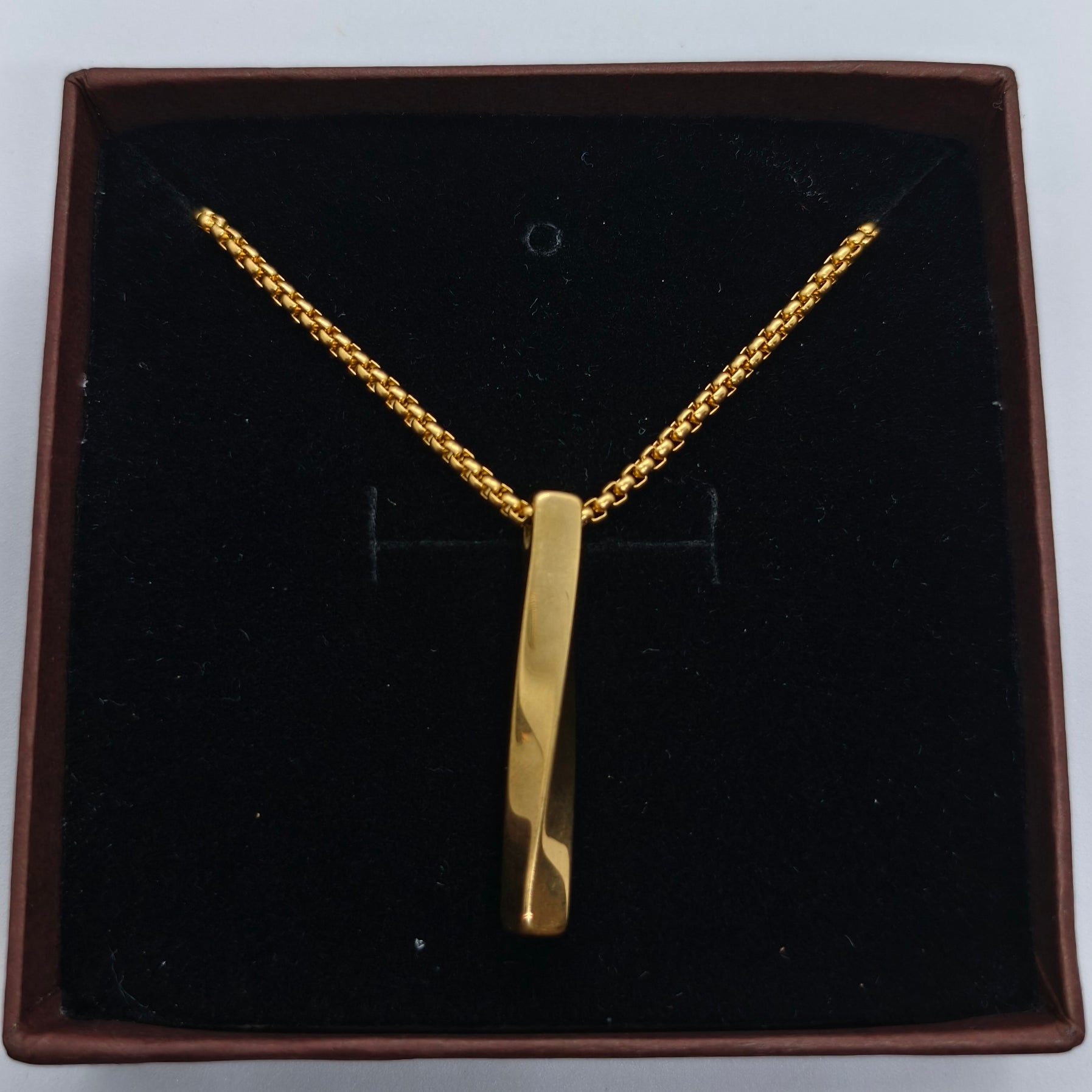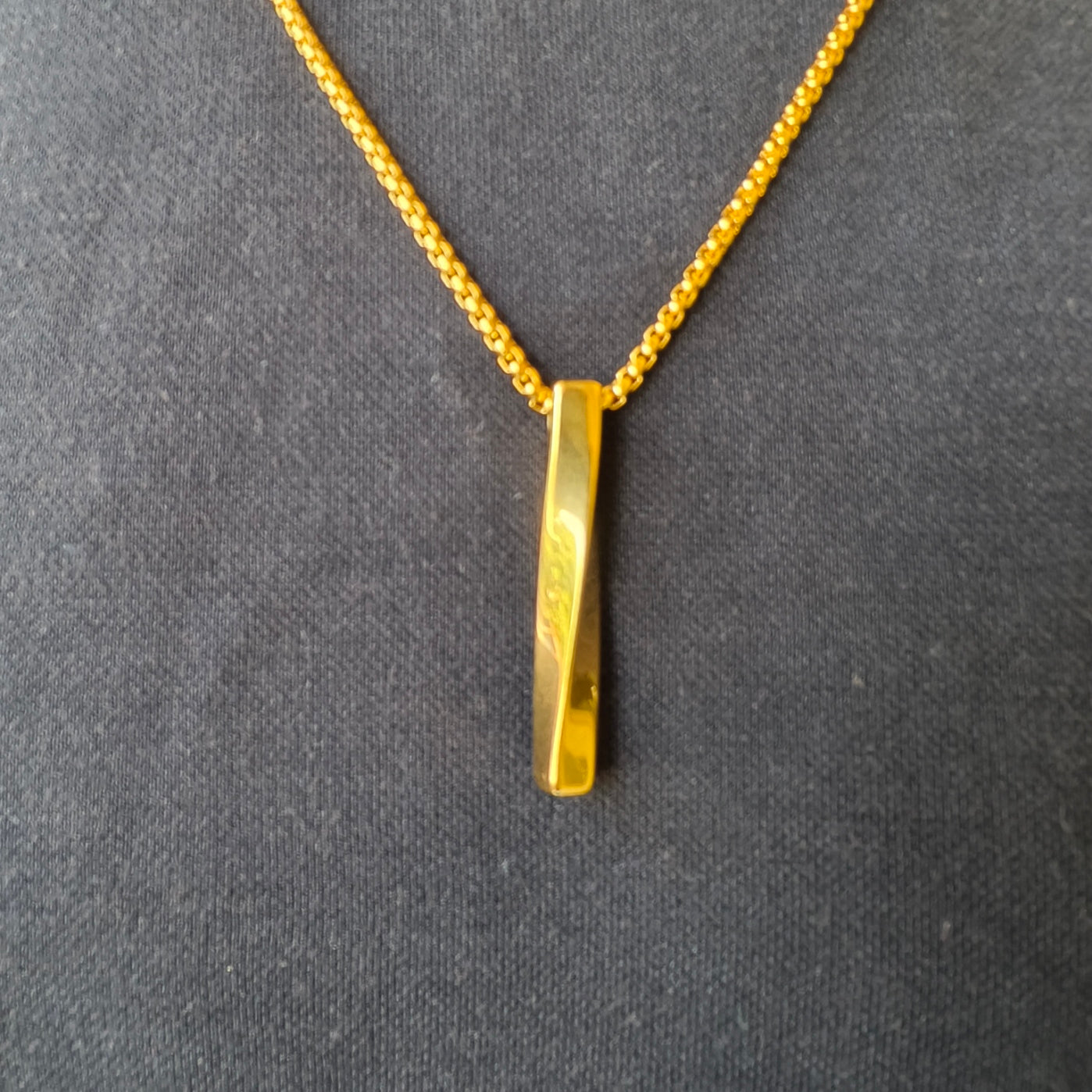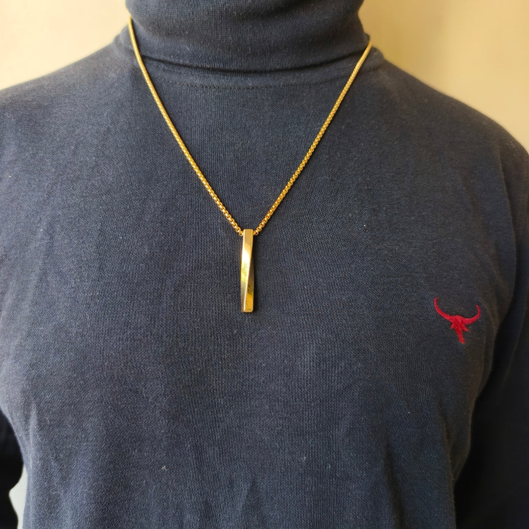 Upgrade your everyday style with the TitanBar Twisted Pendant. Expertly crafted with a sleek, gold-plated bar design and finished with advanced anti-tarnish technology, this pendant is built for the modern man—combining bold sophistication with hassle-free durability. Lightweight, waterproof, and hypoallergenic, Twisted TitanBar adds a touch of luxury to any look without fading or tarnishing.